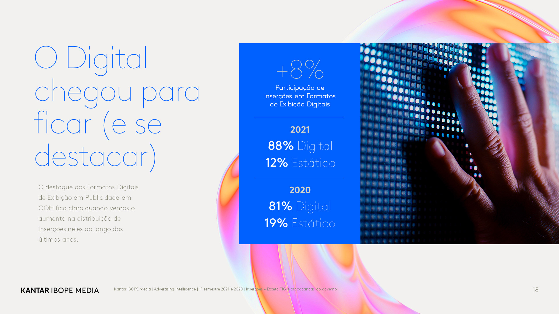Elaborei a proposta visual e logotipo para este estudo, que enfatiza a mídia exterior (Out of Home) como um meio inovador que se integra cada vez mais ao nosso dia a dia. Com elementos visuais e táteis, essa modalidade de publicidade marca presença de maneira consistente em locais públicos, como ruas e avenidas. Outdoors, painéis de LED e front lights são alguns dos formatos que podem ser integrados em uma estratégia eficiente.